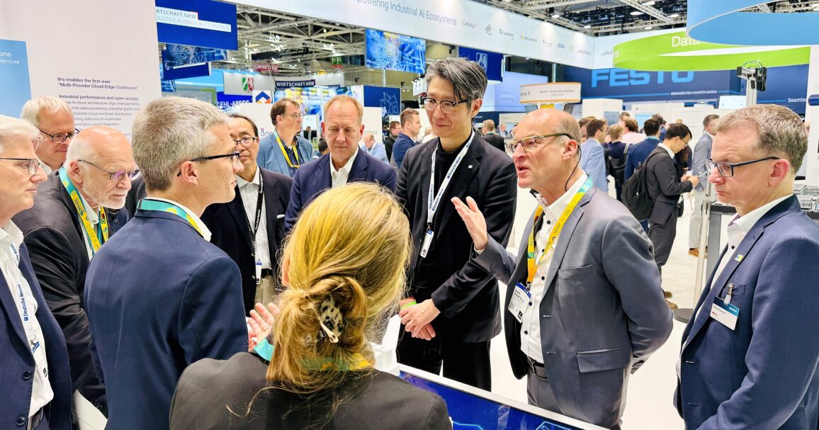The industrial perspective was represented by leaders such as Tim Höttges (CEO, Deutsche Telekom), who engaged in a strategic dialogue regarding the progress of the 8ra Initiative and the specific developments within the EdgeConnect project. The international dimension of the 8ra mission was further underlined by Taro Shimada, CEO of Toshiba, who took extensive time at the stand to explore the underlying architecture and the technical foundations of sovereign, cross-provider collaboration.